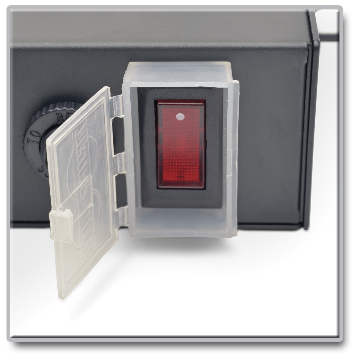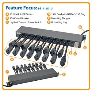 The lighted on/off switch features a transparent cover that eliminates accidental shut-offs while still allowing you to see at a glance whether the PS1916D1U is turned on. A built-in, 15-amp circuit breaker prevents dangerous circuit overloads that could damage equipment. The breaker immediately shuts off AC input to the PS1916D1U when it detects that the equipment load is drawing too much power.
