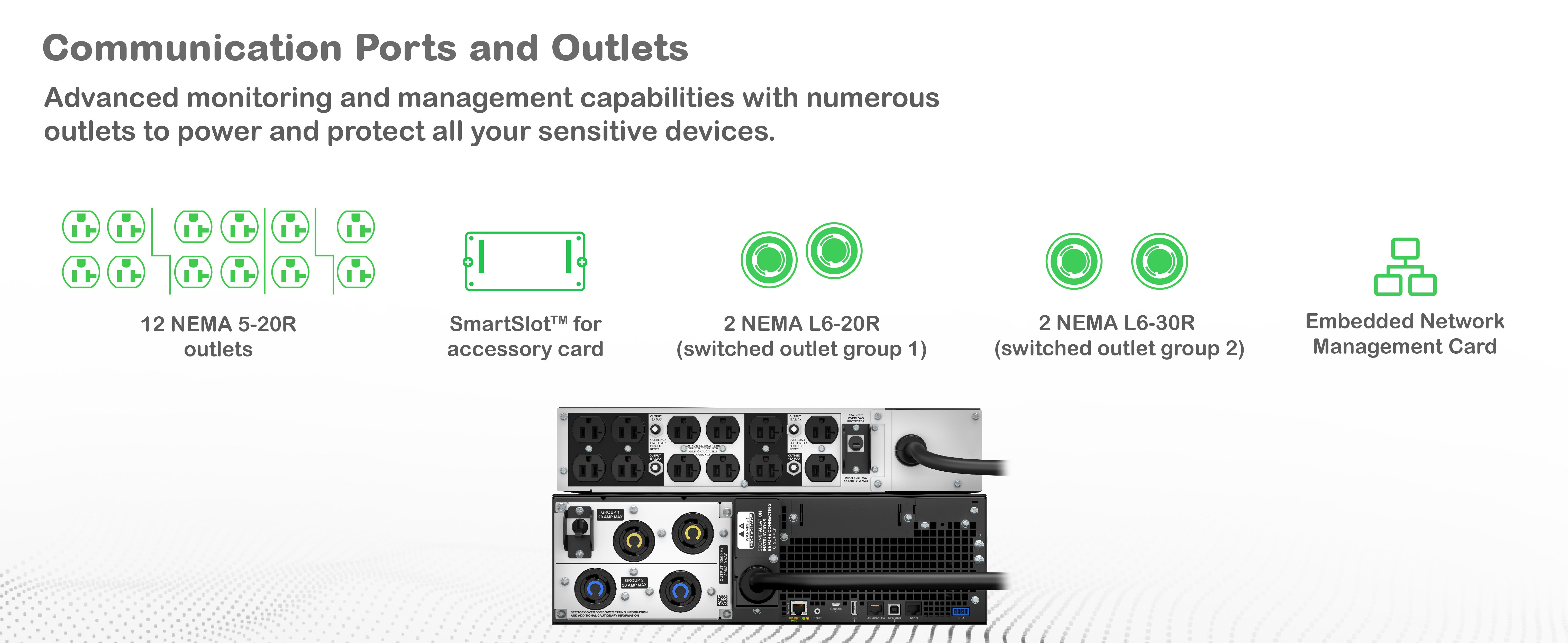 16 outlets in 5U (12) NEMA 5-20R, (2) NEMA L6-20R, (2) NEMA L6-30R , including 2 switched outlet groups |