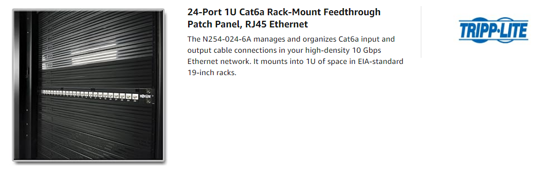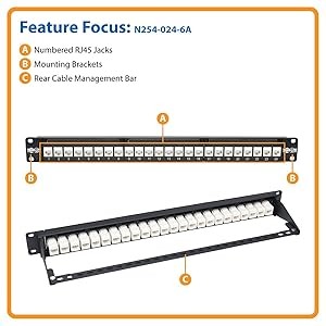 The N254-024-6A meets or exceeds Cat6a specifications and works with USOC, T568A and T568B wiring to comply with industry standards. Fully rated for 10 Gbps Ethernet data transfer speeds, the low-profile panel requires no 110 punchdown termination. Just plug your Cat6a cables into the 24 RJ45 coupler jacks on both sides of the panel. Jacks are clearly numbered and labeled to help you identify connections.