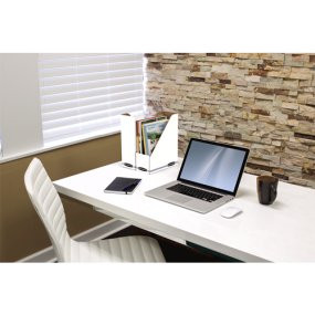 Sturdy corrugated construction for moderate usage. Holds standard letter size materials. Ideal for use on desk or shelf. Helps to keep your space organized. Easy set up and lightweight.