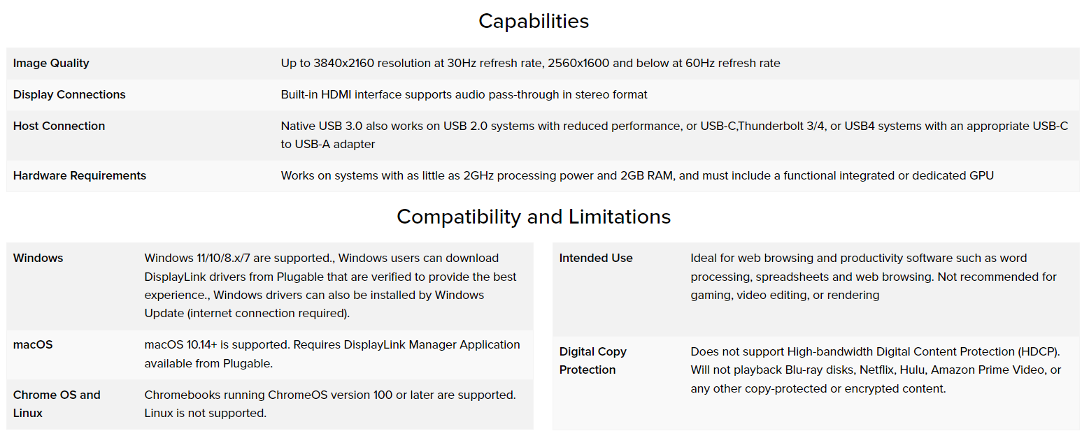 Featuring the DisplayLink DL-5500 graphics chipset, the Plugable UGA-4KHDMI USB 3 to HDMI 4K adapter allows you to add additional monitors to virtually any Windows or Mac laptop (including M1, M2, M3, or Intel), desktop, or tablet (one USB graphics card adapter required per monitor, up to six on Windows PCs and four on macOS). Multitask with a dedicated monitor for each document or application. Supports HDMI monitors via USB-A to HDMI DisplayLink chipset. USB-C, Thunderbolt 3/4, or USB4 system will require a USB-C to USB-A adapter (sold separately).