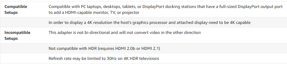 How important is an Active Adapter? Active Adapters use an integrated chipset to convert the DisplayPort signal from the computer to an HDMI signal. The Plugable adapter supports resolutions up to 4K (3840x2160) 60Hz on displays with Standard Dynamic Range (SDR), and 4K 30Hz with High Dynamic Range (HDR) capable displays.