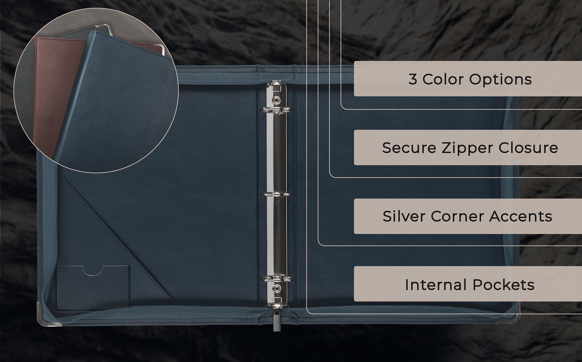 Classic zipper binders come with three color options, secure zipper closure and silver corner accents.