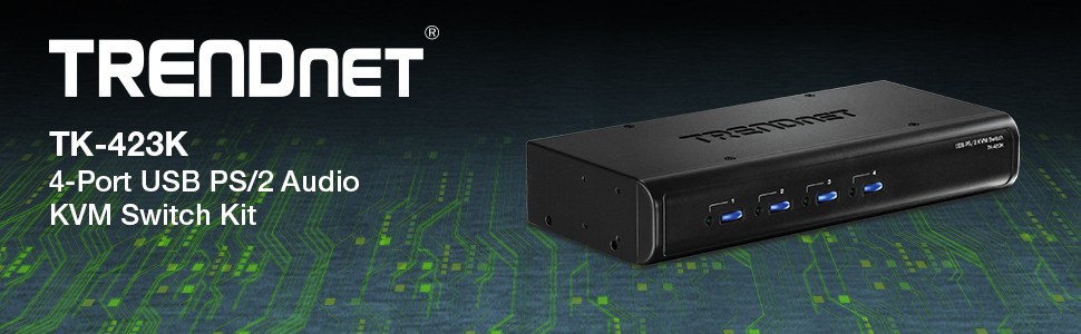 The 4-Port USB PS/2 KVM Switch Kit (TK-423K) provides control of 4 computers/servers with just one set of console controls. Independent audio/mic and PC port selection provide additional flexibility. LED indicators show connection status and a buzzing sound confirms port switching. With Hot-Key controls and all required cables included, this versatile device is the perfect choice for managing 4 computers.