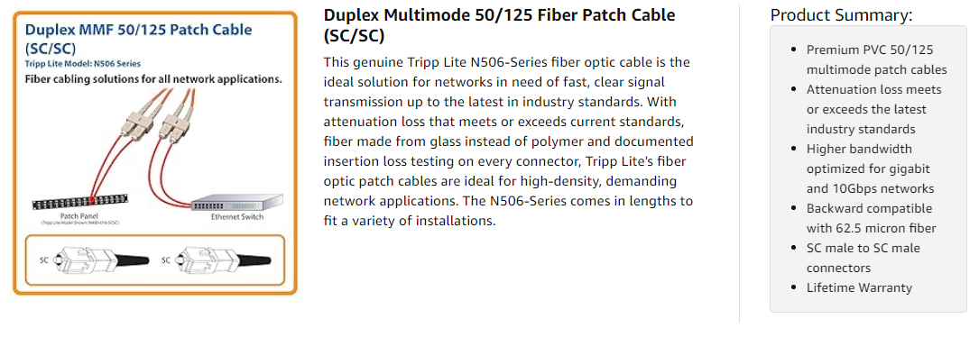 The N506-Series is manufactured using top quality materials. With 50/125 duplex fiber, a FDDI and OFNR-rated PVC jacket, sturdy connectors and fiber made from glass instead of a polymer, Tripp Lite's fiber optic cables are made to last in high-demand data center and networking applications.
