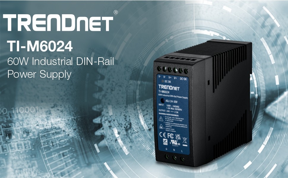 TRENDnet’s AC to DC Industrial DIN-Rail Power Supply, model TI-M6024, supplies up to 60W (24V DC, 2.5A) of power to industrial