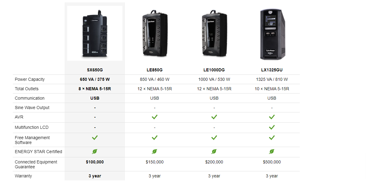 CyberPower's patented GreenPower design reduces power consumption using a compact charger and power inverter to create an ultra-efficient backup power system.