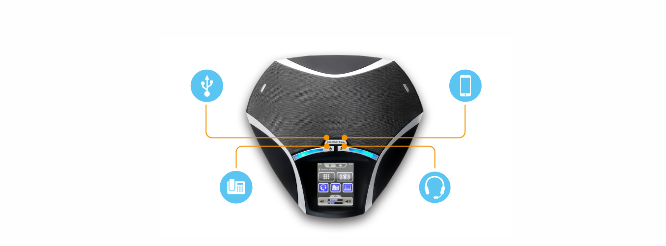 The speakerphone serves as a hub for your communications, connecting to computers, mobile phones/tablets and desk phones. The Konftel 55Wx also has Bluetooth for easier pairing, as an extra feature compared with the simpler Konftel 55. Calls via a computer can be bridged with calls via a desk phone or mobile phone. Switch and combine connections easily on the touchscreen, which only shows the options available at the time.