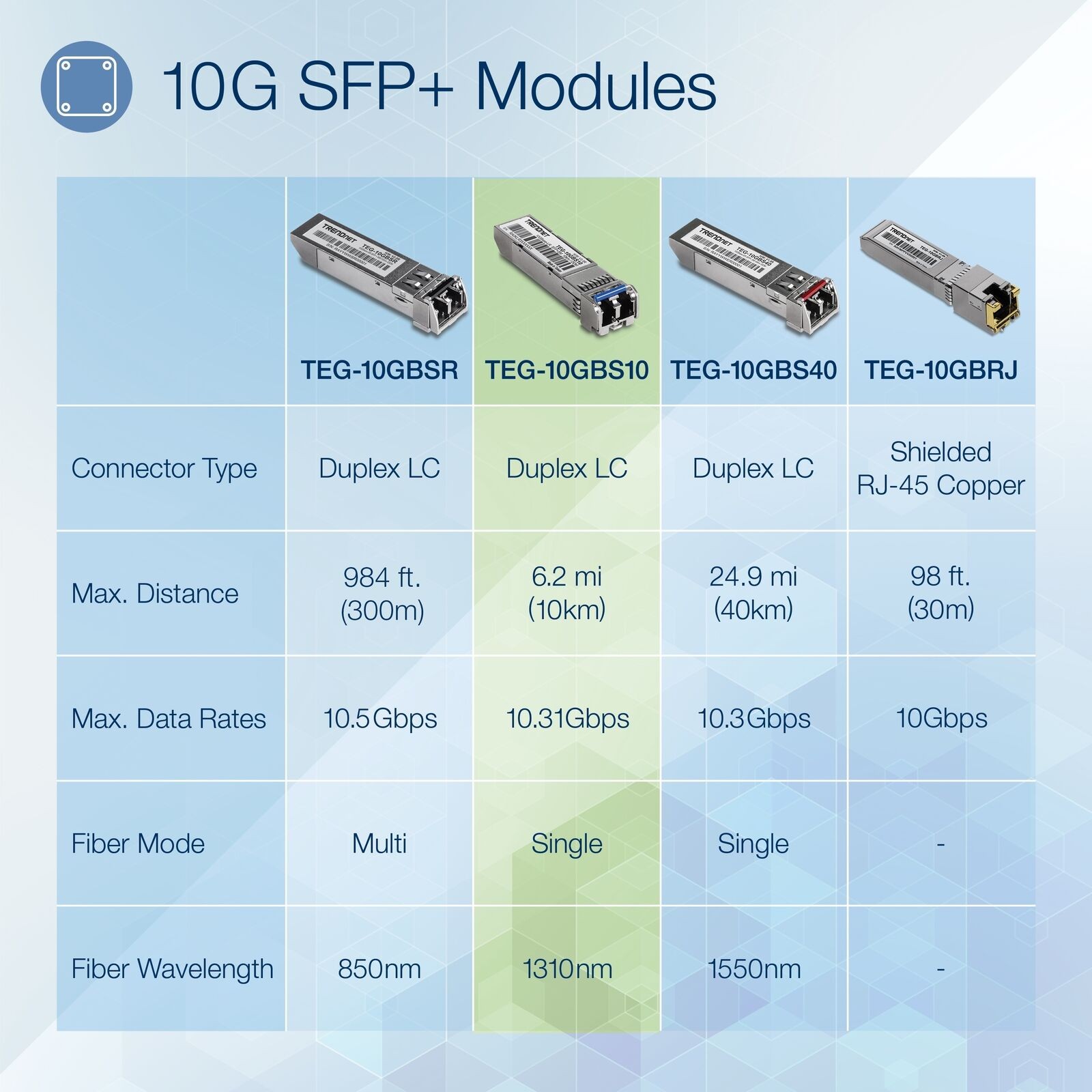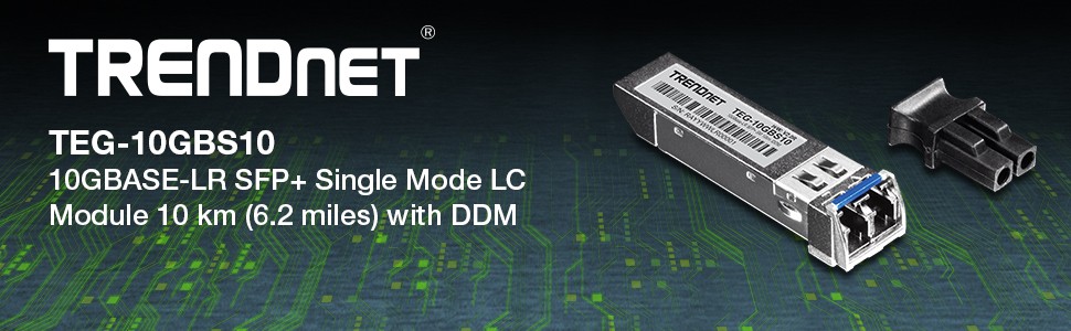 TRENDnet's TEG-10GBS10 10GBASE-LR SFP + Hot Plug Single Mode LC Module works with an MSA compliant SFP + slot. This single-mode transceiver covers distances up to 6.2 mi (6.2 miles), comes with a duplex LC connector, and supports network throughput speeds of up to 10.5 Gbps. Digital Diagnostic Monitoring (DDM) captures critical device parameters such as transmit / receive power, temperature, and voltage.