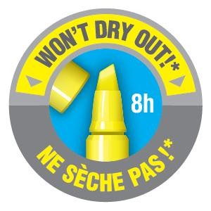 BIC Brite Liner Highlighters won't dry out when the cap is left off for 8 hours so you can use them for long periods of time without having to switch to another highlighter.