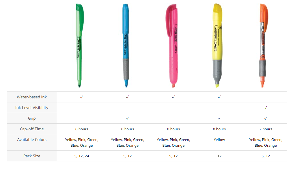 BIC Brite Liner Highlighters come in super bright fluorescent ink colors; yellow, pink, green, blue and orange, making it easy and fun to organize information in school books, documents, or notes.