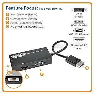 The P136-06N-HDV-4K is compatible with laptops, tablets and other devices equipped with a female DisplayPort. It’s completely plug-and-play with no software or drivers to install or external power supply needed. With its small size and built-in cable, the P136-06N-HDV-4K is perfect for stowing in your laptop bag and carrying to school, the office or the latest trade show.