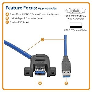Backward compatible with earlier USB generations, the one-foot U324-001-APM features premium foil and braid shielding to deliver reliable, error-free signal quality and protection from EMI/RFI interference. Molded nickel-plated connectors with gold-plated copper contacts ensure excellent conductivity. Integral strain relief ensures the cable and connectors last a long time. A rugged PVC jacket protects twisted 28 AWG data lines and 24 AWG power lines.