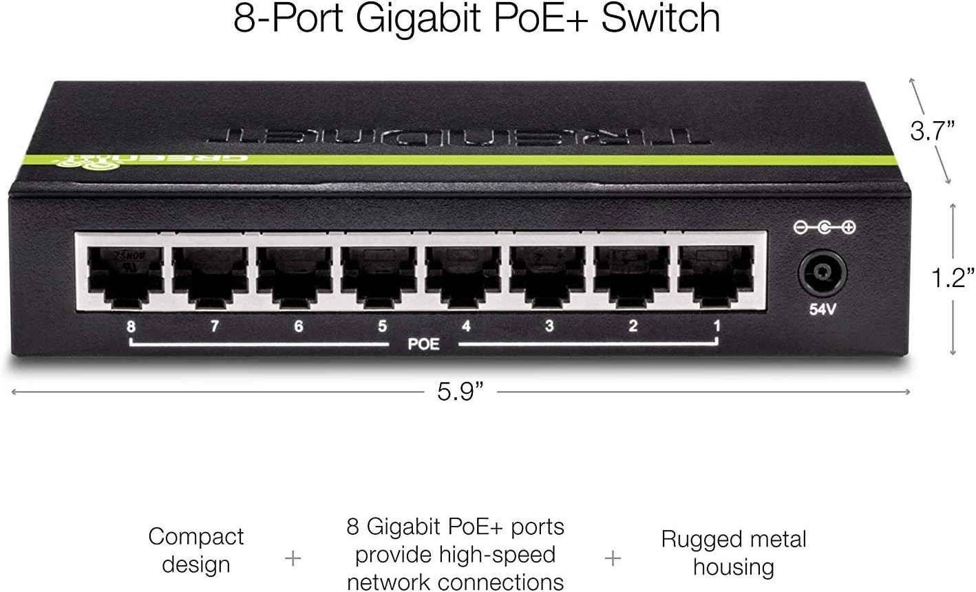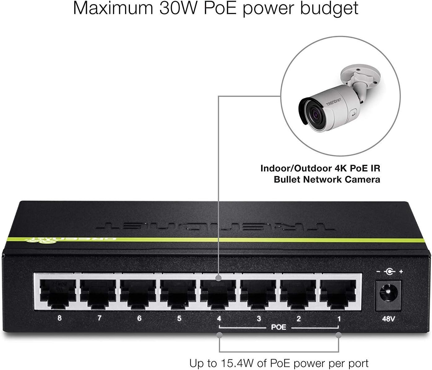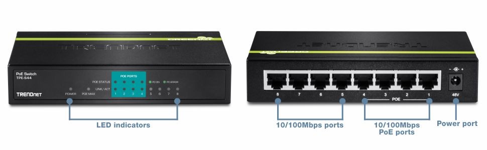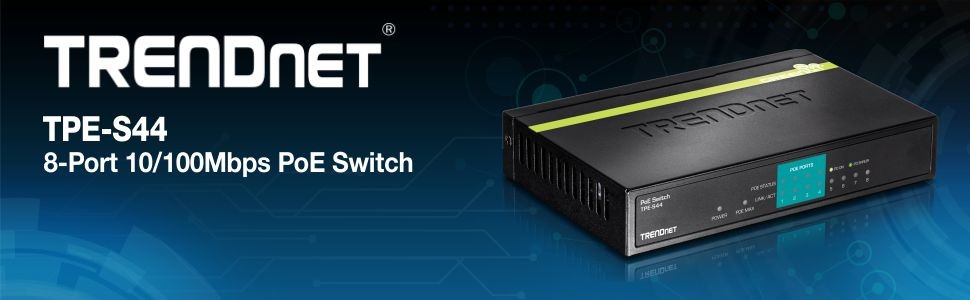 TRENDnet's 8-Port 10/100Mbps PoE Switch, model TPE-S44, offers 4 x 10/100Mbps PoE ports, 4 x 10/100Mbps ports, a 1.6Gbps switching capacity, and a PoE power budget of 30 Watts. Plug and Play this sturdy metal switch for reliable high speed PoE networking.
