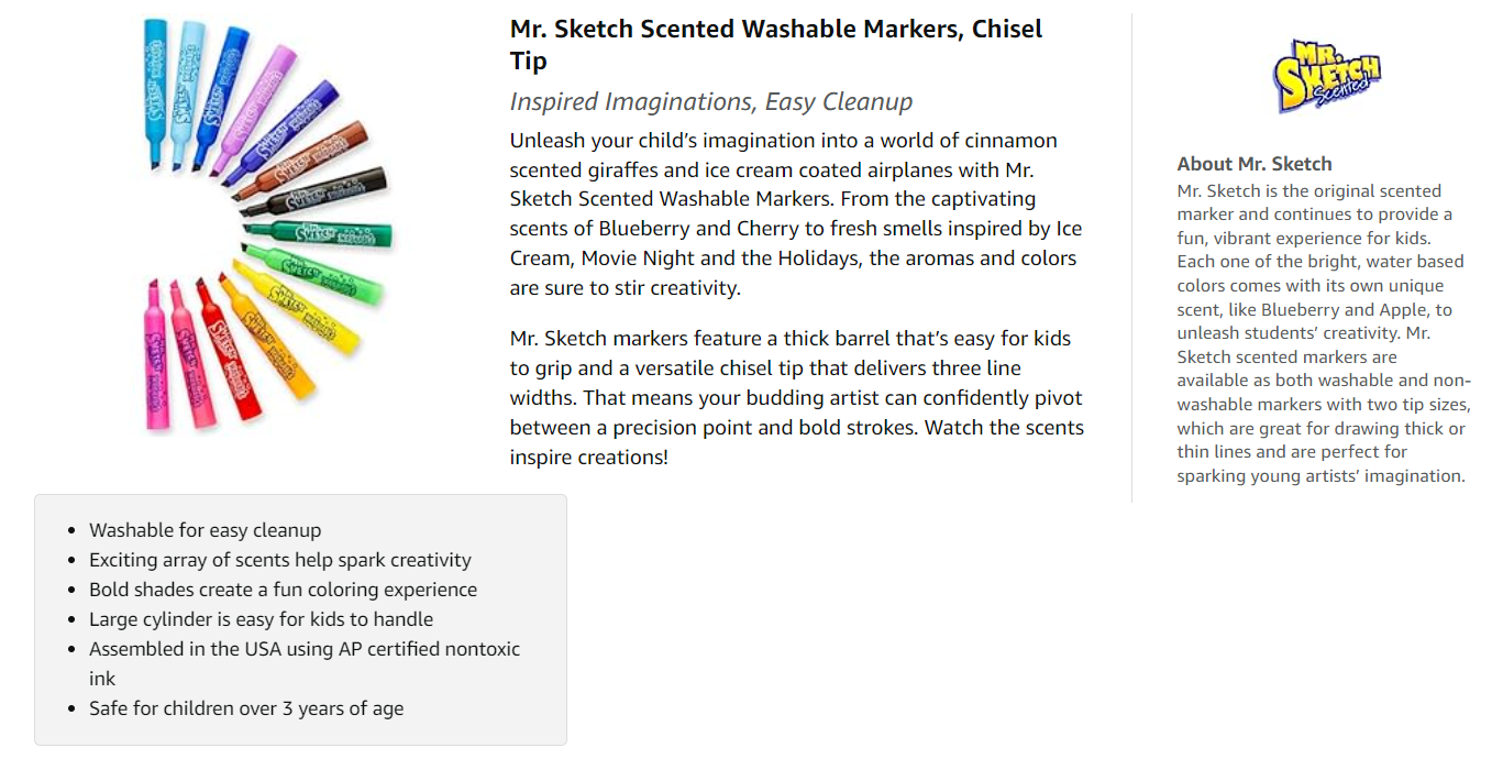 Washable & Care InstructionsMr. Sketch scented washable markers wash from skin and most washable children's clothing. Wash promptly for best results. Repeat washing may be required. Keep away from wallpaper, painted walls, finished and unfinished wood, vinyl, carpeting and other materials that cannot be laundered. |