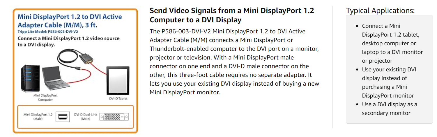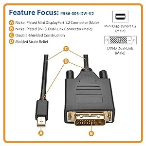 Because it’s an active adapter, the P586-003-DVI-V2 converts both Single-Mode and Dual-Mode (DP++) Mini DisplayPort output. It’s also perfect for use with graphics cards, such as AMD Eyefinity, that don’t output DP++ signals.