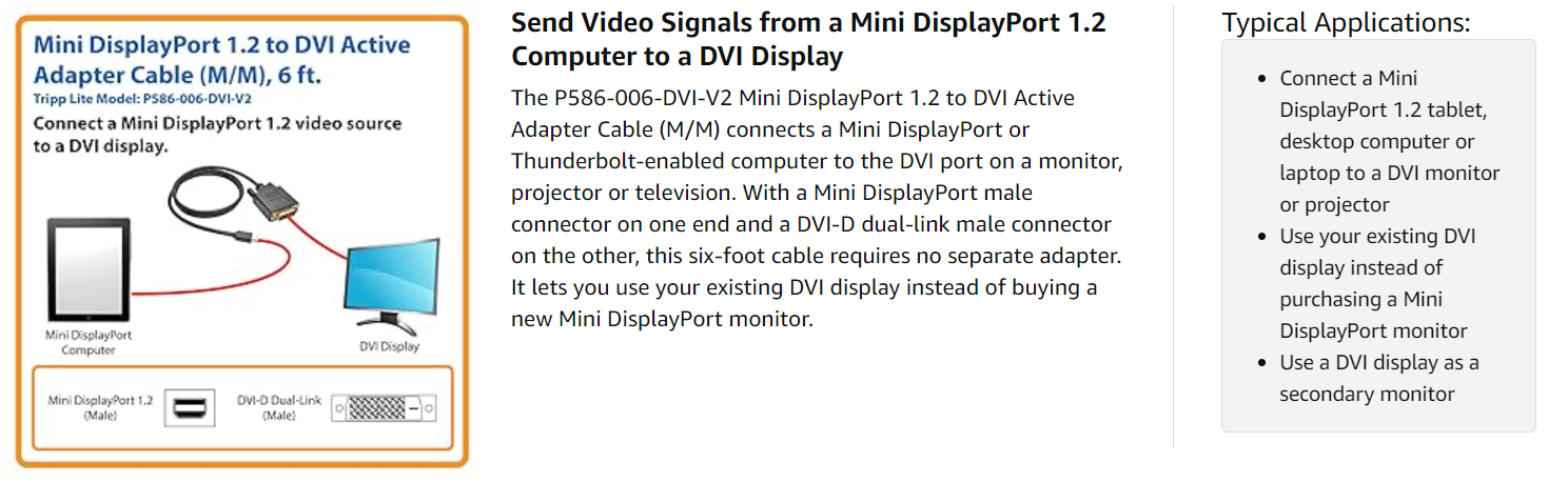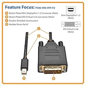Because it’s an active adapter, the P586-006-DVI-V2 converts both Single-Mode and Dual-Mode (DP++) Mini DisplayPort output. It’s also perfect for use with graphics cards, such as AMD Eyefinity, that don’t output DP++ signals.