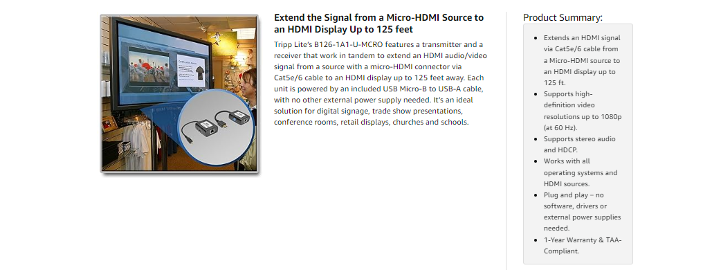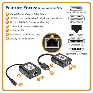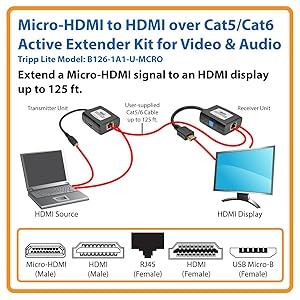 With no software or drivers to install, the B126-1A1-U-MCRO’s plug-and-play setup gets your application up and running faster, no matter which major operating system you use. The transmitter’s built-in Micro-HDMI cable connects to the audio/video source, while the receiver’s built-in HDMI cable connects to the display. An inexpensive user-supplied Cat5e/6 cable (for best results, use a 24 AWG solid-wire cable, such as Tripp Lite’s N202-Series) connects the transmitter and the receiver. Each unit is powered by an included USB Micro-B to USB-A cable, which must be connected between the unit and a USB port on the source, display or USB wall charger. Built-in LEDs indicate the units are receiving power and a signal from the source.