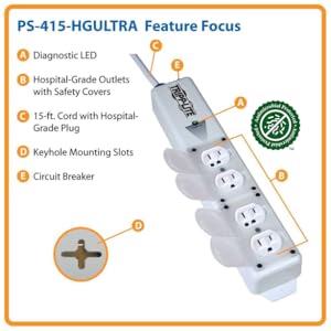With Tripp Lite's PS-415-HGULTRA Medical-Grade Power Strip, you'll have reliable outlets where you need them. The PS-415-HGULTRA provides four hospital-grade outlets in an all-metal housing that ensures total safety and is guaranteed to last for life. The unit's patented internal wiring provides ultimate shock prevention and UL 60601-1 compliance. The unit also comes with built-in outlet safety covers to shield unused outlets from debris and accidental contact. The switchless design prevents accidental shutoff, while a 15-amp circuit breaker guards against dangerous circuit overloads before they happen. Additionally, the PS-415-HGULTRA comes with a lifetime product warranty for guaranteed peace of mind.