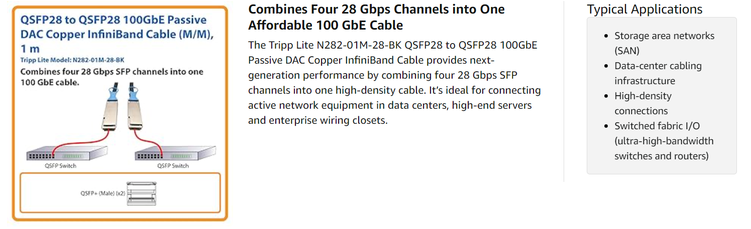 The N282-01M-28-BK undergoes a rigorous assembly and testing procedure aimed at reducing signal loss. It’s fully compliant with the MSA (Multi-Source Agreement) SFF-8665 architecture for guaranteed compatibility with all QSFP and QSFP+ ports, as well as IEEE 802.3bj.