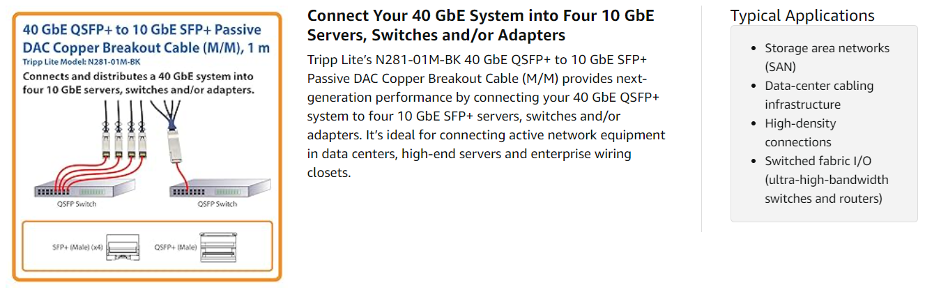 The N281-01M-BK undergoes a rigorous assembly and testing procedure aimed at eliminating unnecessary signal loss. It’s fully compliant with the MSA (Multi-Source Agreement) SFF-8431 and SFF-8436 architecture for guaranteed compatibility with all QSFP and QSFP+ ports. Compatible with SDR, DDR and QDR.