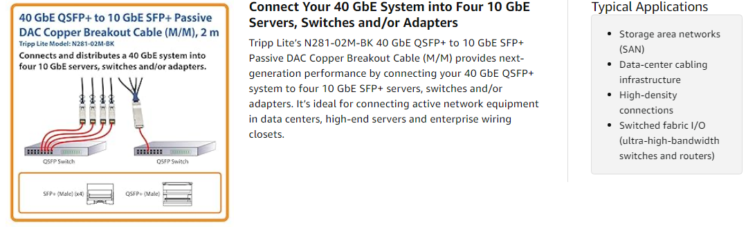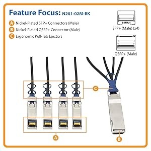 The N281-02M-BK undergoes a rigorous assembly and testing procedure aimed at eliminating unnecessary signal loss. It’s fully compliant with the MSA (Multi-Source Agreement) SFF-8431 and SFF-8436 architecture for guaranteed compatibility with all QSFP and QSFP+ ports. Compatible with SDR, DDR and QDR.