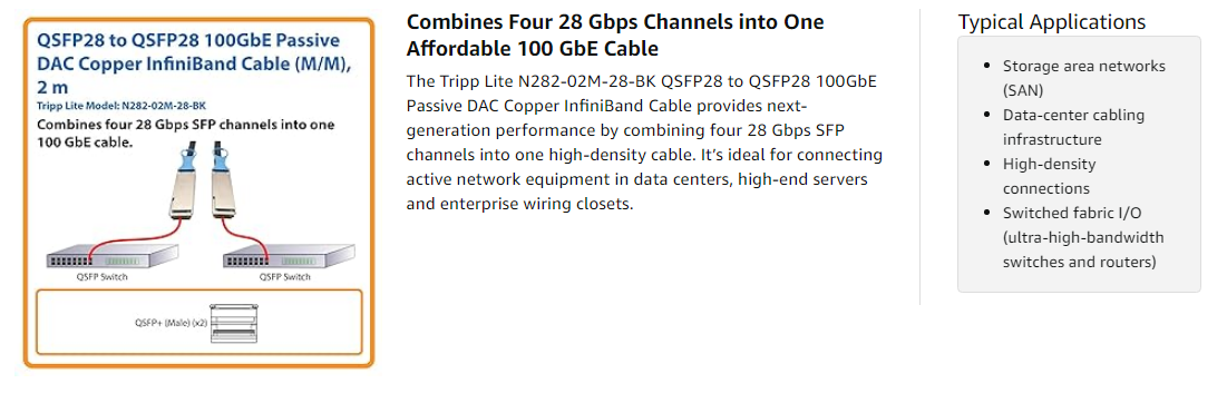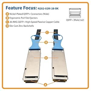 The N282-02M-28-BK undergoes a rigorous assembly and testing procedure aimed at reducing signal loss. It’s fully compliant with the MSA (Multi-Source Agreement) SFF-8665 architecture for guaranteed compatibility with all QSFP and QSFP+ ports, as well as IEEE 802.3bj.