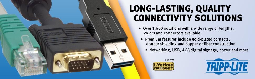 Founded in 1922 in Chicago, Illinois, Tripp Lite is a leading manufacturer of products to power, protect, manage, house, cool, connect and mount your equipment. With a large selection of connectivity products, Tripp Lite has everything from USB hubs and reversible USB cables to fiber-optic cables and over Cat5e/Cat6 signal extenders. Whether you need to connect high-speed networks to switches, routers and servers in your data center, or send high-resolution video signals to displays and digital signs, Tripp Lite has the complete solution. Plus, before and after your purchase, our Chicago-based, in-house technical support specialists are available to assist you by phone, email and live chat. With over 90 years of quality products and service, Tripp Lite is a brand you can trust.