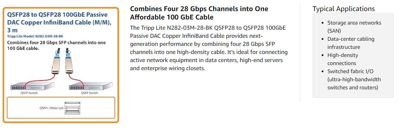 The N282-03M-28-BK undergoes a rigorous assembly and testing procedure aimed at reducing signal loss. It’s fully compliant with the MSA (Multi-Source Agreement) SFF-8665 architecture for guaranteed compatibility with all QSFP and QSFP+ ports, as well as IEEE 802.3bj.