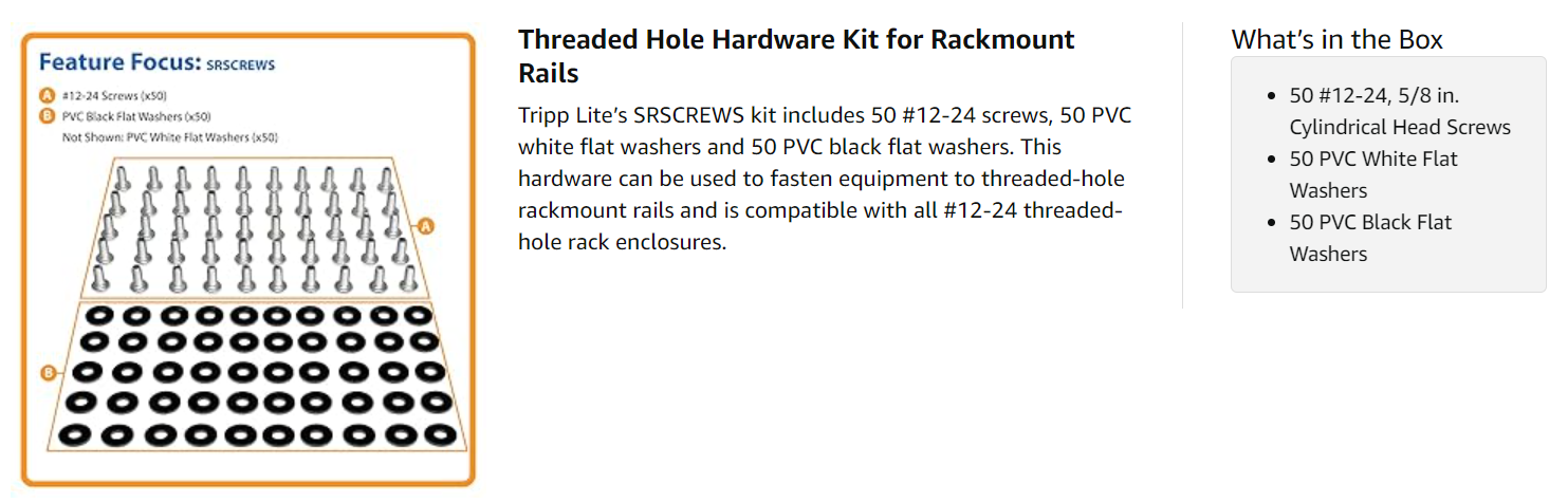 The SRSCREWS kit comes with a 5-year warranty and is RoHS-compliant, reflecting Tripp Lite’s commitment to environmental responsibility.