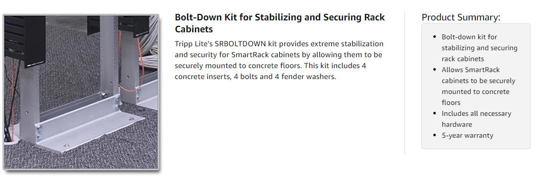 The SRBOLTDOWN comes with a 5-year warranty and is RoHS-compliant, reflecting Tripp Lite’s commitment to environmental responsibility.