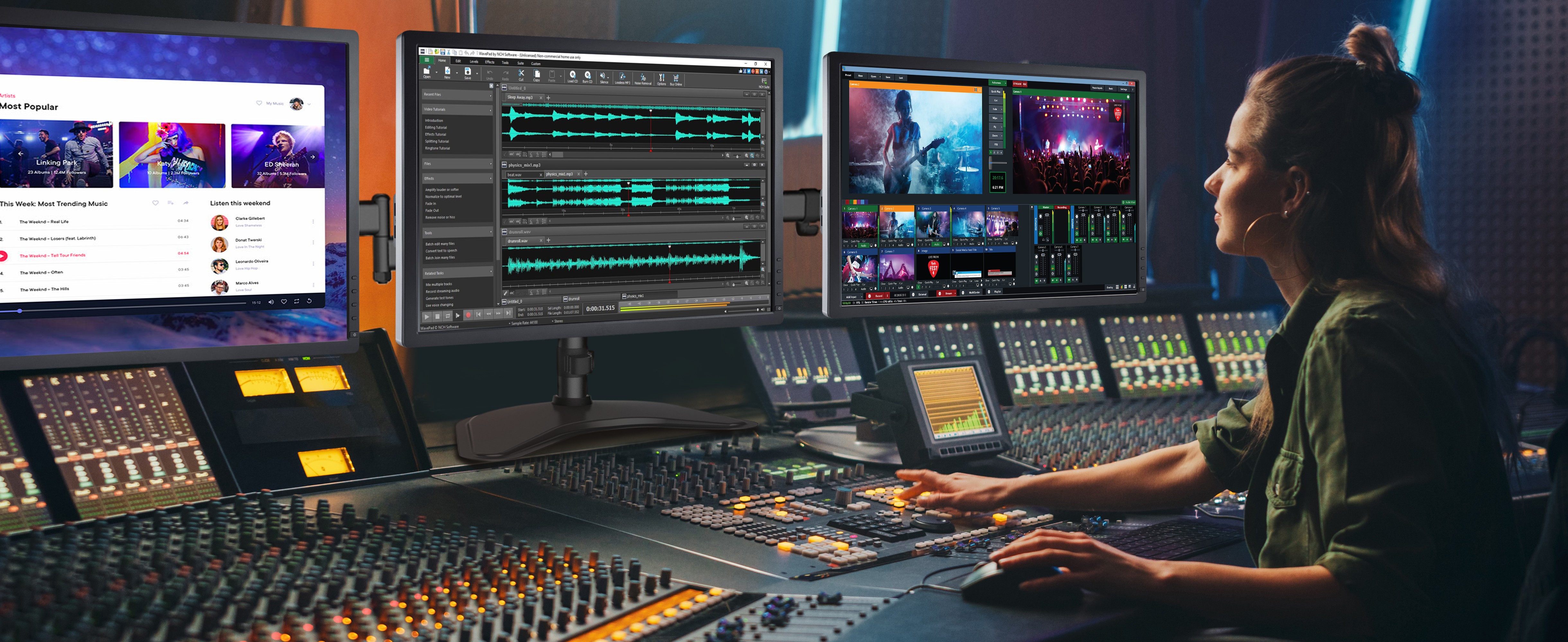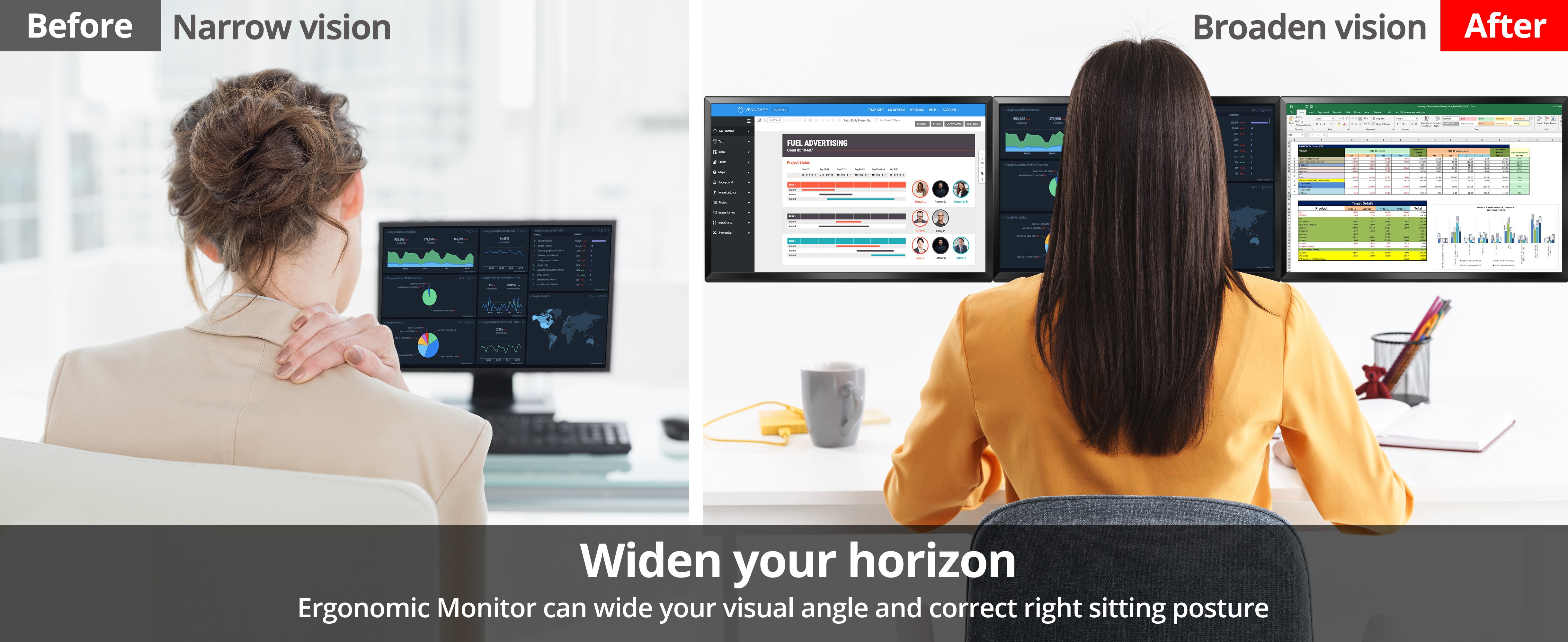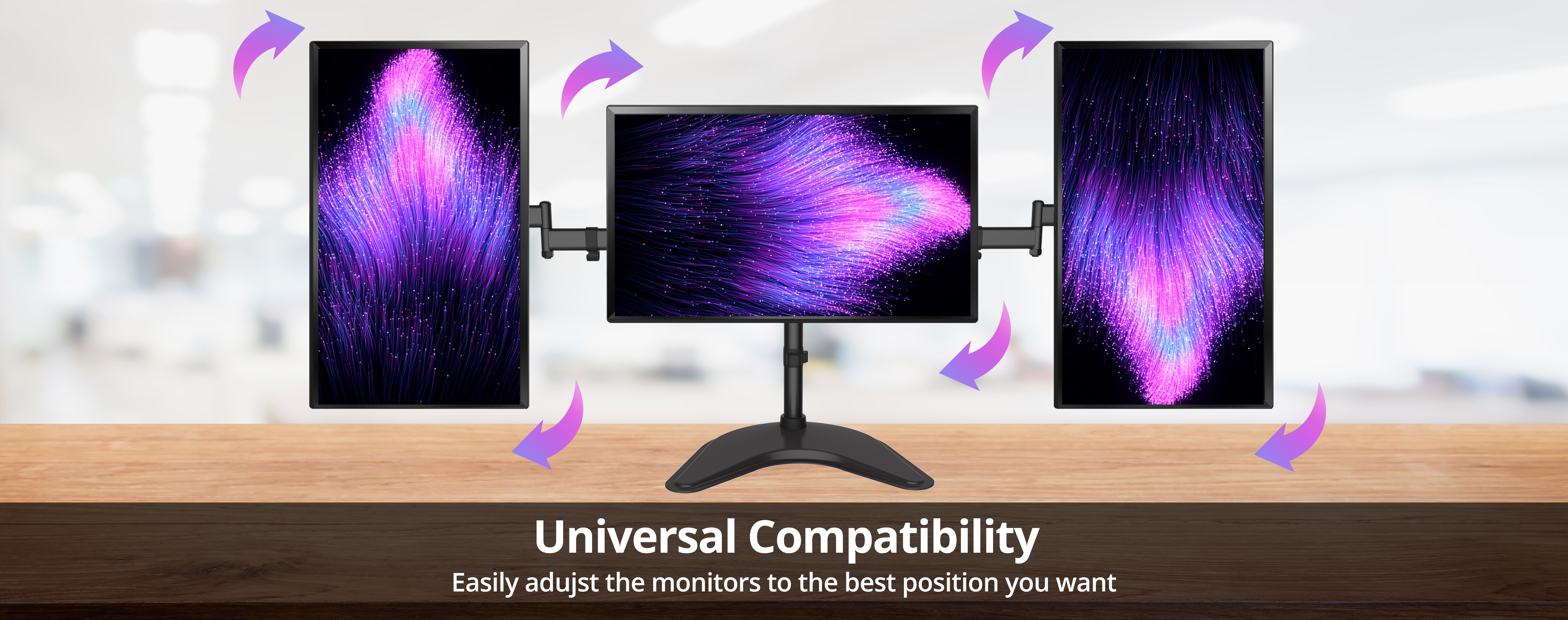 Full-motion side-by-side triple monitor desk stand conserves valuable desk space, Fits 13" to 27", weight up to 17.6lbs each