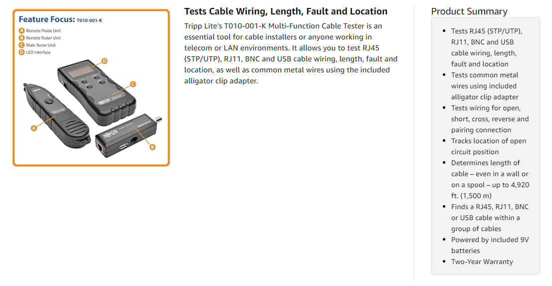 With the T010-001-K, you can test wiring for open, short, cross, reverse and pairing connection, or find an RJ45, RJ11, BNC or USB cable nestled within a group of cables. You can also track the location of an open circuit position, and determine the length of a cable – whether in a wall or on a spool – up to 4,920 feet (1,500 meters).