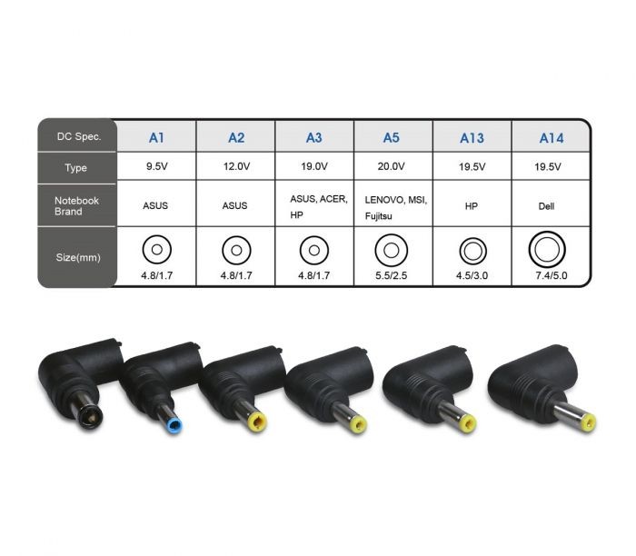 Includes 6 self-regulating adapter tips, each tip can automatically adjust output voltage to support most 45W power compatible laptop or Ultrabook models from ASUS, Acer, Dell, HP, Lenovo, Fujitsu and more
