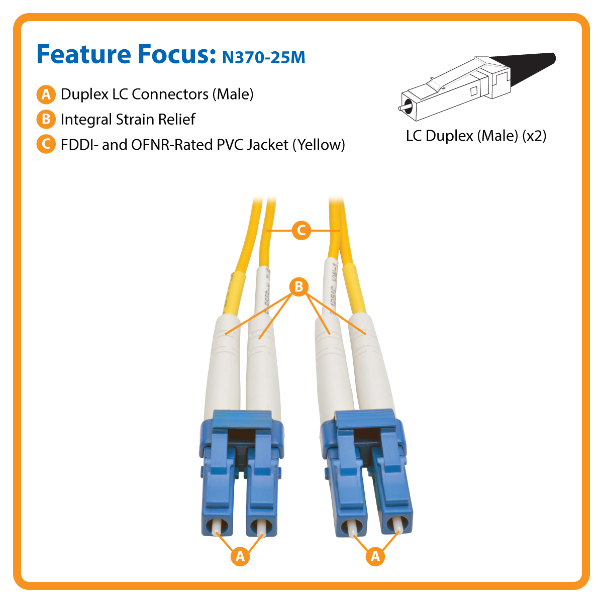 The N370-25M has 8.3/125 duplex (zipcord) fiber made from glass, instead of polymer. The sturdy LC male connectors meet stringent insertion loss standards and feature beveled edges on their glass ends for easy insertion into a patch panel or switch. The FDDI- and OFNR-rated PVC jacket is yellow to easily identify it as a singlemode cable.