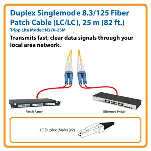 The N370-25M Duplex Singlemode 8.3/125 Fiber Patch Cable (LC/LC) transmits fast, clear data signals through your LAN with a higher bandwidth than multimode cable for up to twice the throughput. Designed for network equipment that requires singlemode fiber optic patch cables, this 25-meter (82-foot) cable has attenuation loss that meets or exceeds current standards.