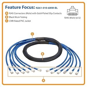 The 10-foot N261-010-6MM-BL is constructed of 23 AWG solid conductor wire with a blue CMR-rated PVC jacket, and all components meet or exceed ANSI/TIA-568-C.2 category requirements for performance. Black mesh tubing keeps the cable neat and protects against fraying and damage. The 18-inch breakout legs are labeled for quick identification.