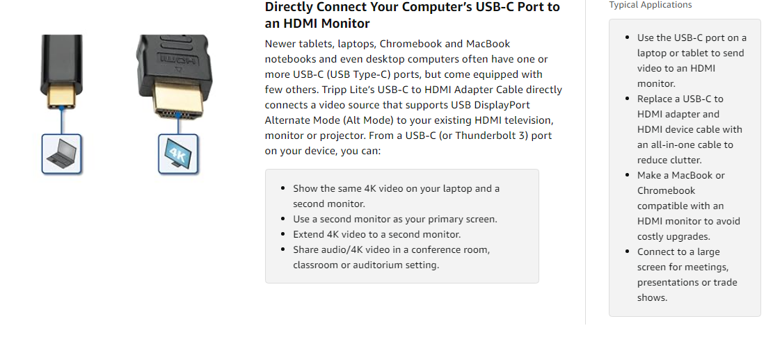 This adapter cable supports USB DisplayPort Alternate Mode for transmitting digital audio and ultra high-definition video: