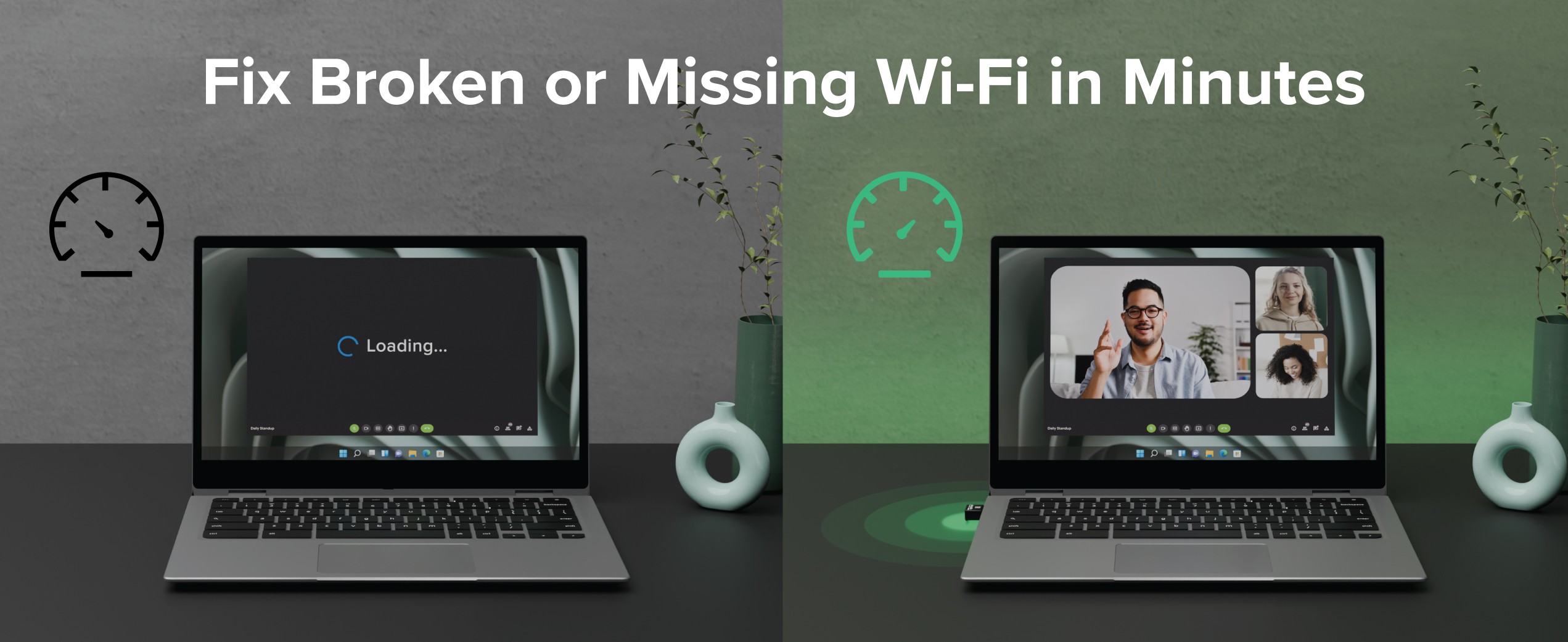 The Plugable Nano WiFi USB Adapter is a simple way to add WiFi to a desktop, or to keep plugged into a laptop whose built-in WiFi isn't working anymore.