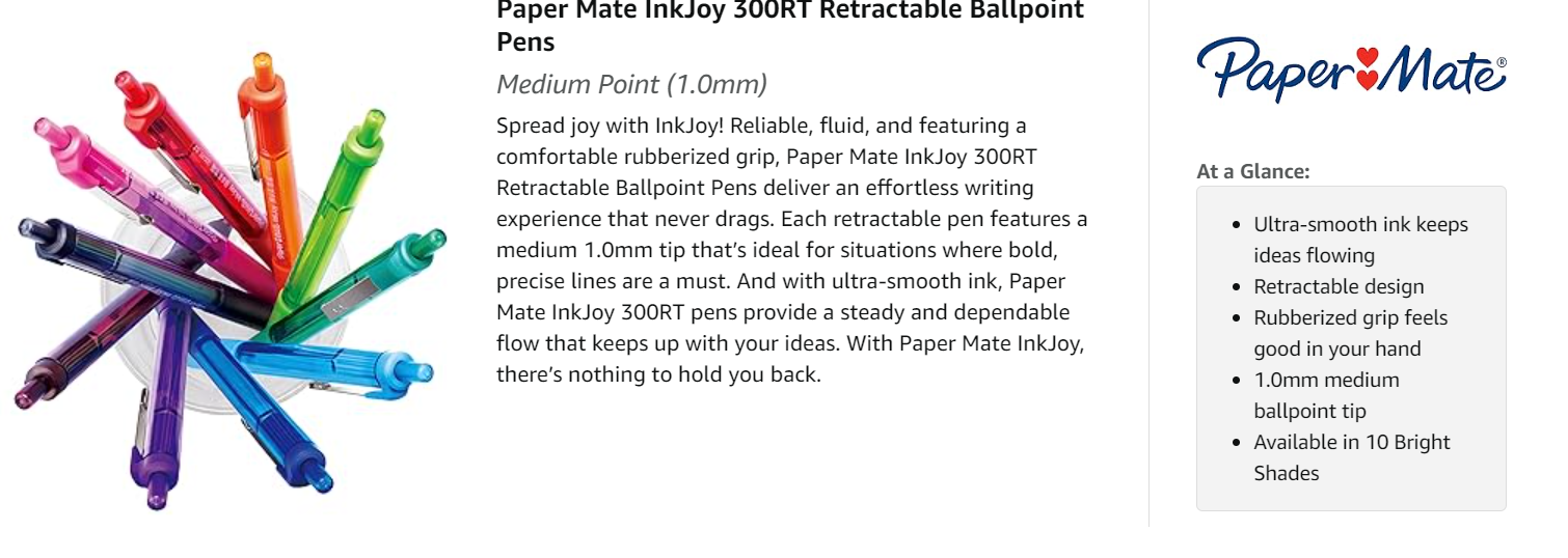 Equipped with the revolutionary InkJoy writing system, each 300RT retractable ballpoint pen combines ultra-smooth ink with a writing-optimized ballpoint tip that spreads the ink evenly and reliably. The tip is designed to release ink upon contact with paper, reducing drag.