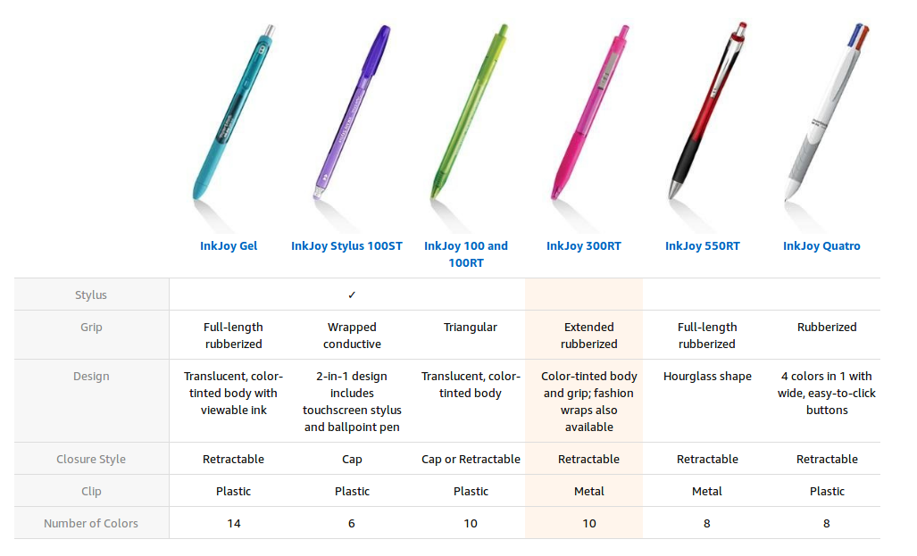 Equipped with the revolutionary InkJoy writing system, each 300RT retractable ballpoint pen combines ultra-smooth ink with a writing-optimized ballpoint tip that spreads the ink evenly and reliably. The tip is designed to release ink upon contact with paper, reducing drag.