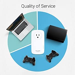 The powerline kit includes Quality of Service (QoS) setup for simplified network traffic control.