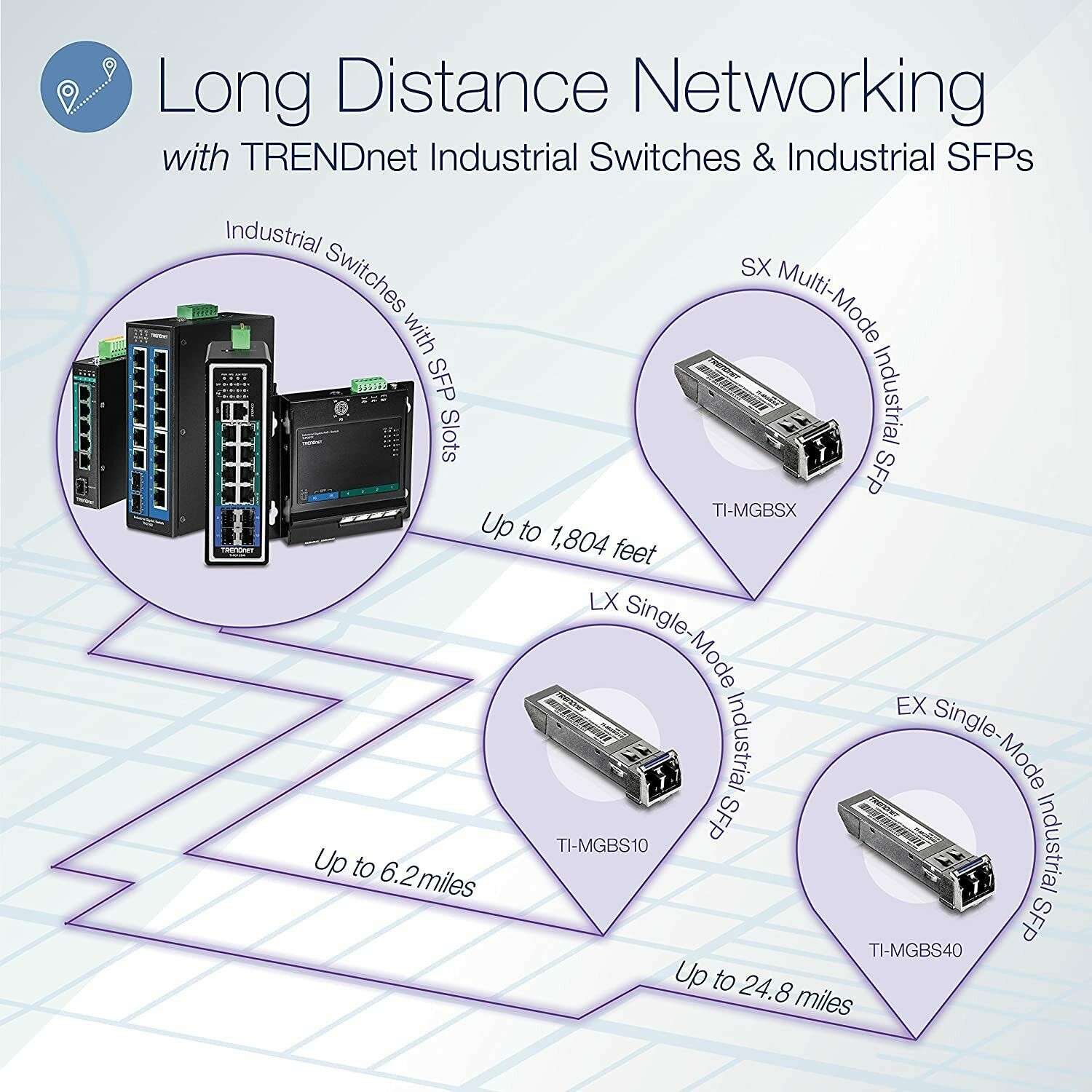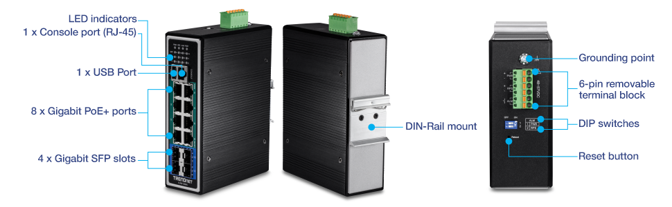 TRENDnet's Industrial Gigabit L2+ Managed DIN-Rail Switch series offers advanced layer 2 managed features with enhanced traffic controls to meet the evolving demands of today's SMB networks. Each industrial layer 2 managed switch is equipped with an IP30 rated metal enclosure, designed to withstand a high degree of vibration and shock, while operating within a wide temperature range of -40° – 75° C (-40° – 167° F) for industrial environments. Our industrial layer 2 managed switch models feature copper Gigabit ports for high-speed device connections, and SFP slots that support 1000Base-FX modules for long distance fiber networking applications.