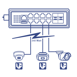 A 240W PoE power budget supplies up to eight Power over Ethernet devices, and includes advanced PoE port controls such as enabling / disabling PoE, power priority, PD alive check, and power scheduling.