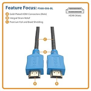 The six-foot molded 30 AWG cable features premium foil and braid shielding to deliver top-of-the-line signal quality and protection from EMI/RFI interference. Gold-plated blue connectors ensure excellent conductivity. Integral strain relief ensures the cable and connectors last a long time. A flexible PVC jacket makes the HDCP-compliant cable easy to install in tight spaces.