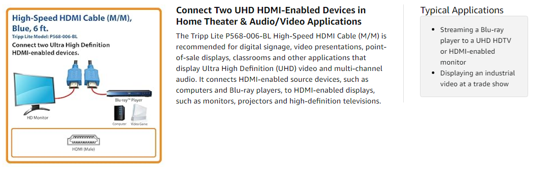 This cable supports UHD video resolutions up to 3840 x 2160 (4K x 2K), including full 1080p, and data transfer speeds up to 18.0 Gbps—the fastest bandwidth currently available over HDMI. When used with an Apple digital A/V adapter, it supports iPad2 video mirroring for playing games, watching videos or displaying presentations. Backward compatible with previous HDMI generations, the P568-006-BL works in all HDMI cabling scenarios.