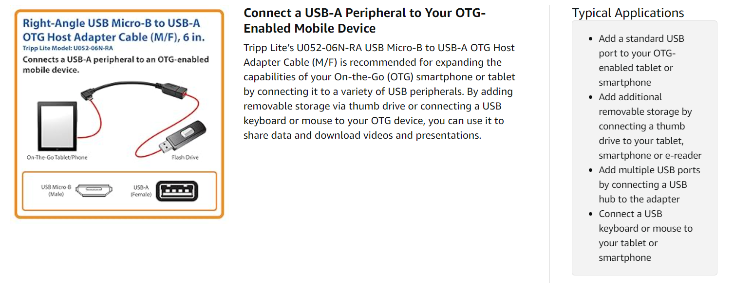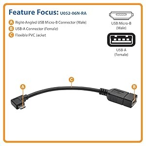 The six-inch U052-06N-RA is plug-and-play with no software, drivers or external power supply needed. Just connect its USB Micro-B plug to your OTG-enabled device, and connect the USB peripheral to the adapter’s USB 2.0 port. You can also connect a USB hub to the adapter to create more USB ports and connect more USB devices.