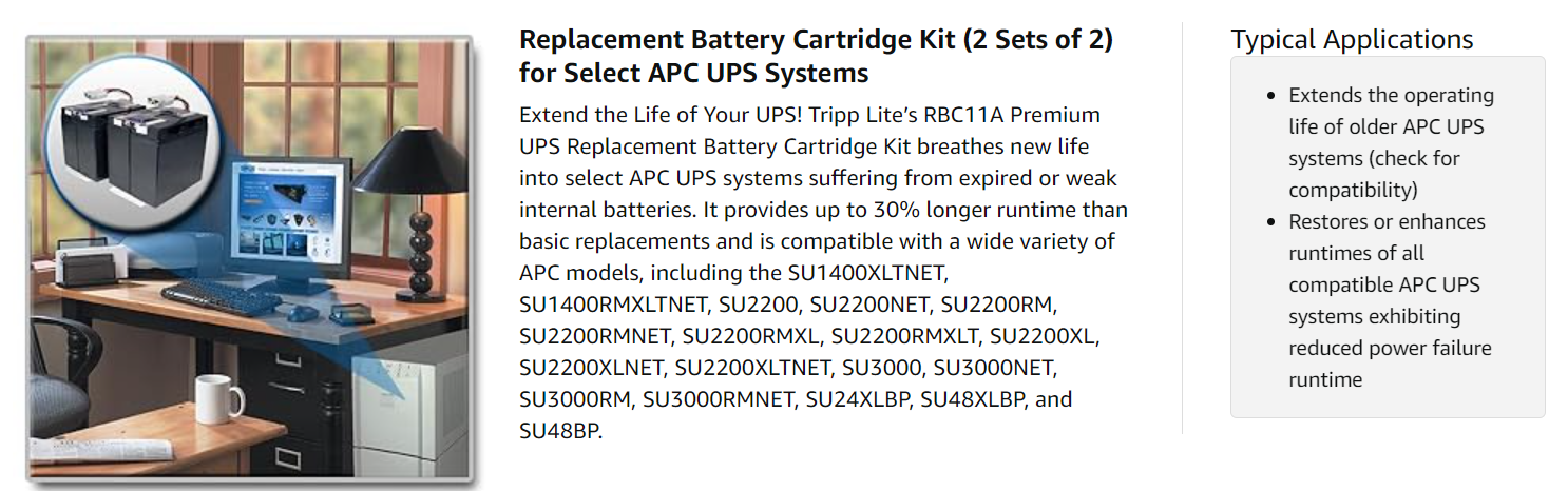 Like every Tripp Lite battery cartridge, RBC11A batteries are carefully screened and OEM-certified to meet or exceed original manufacturer specifications.
