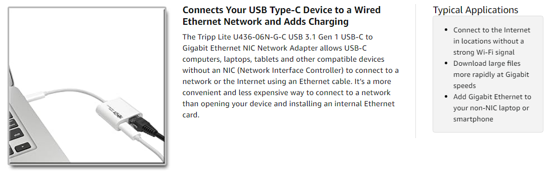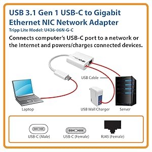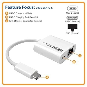 Connect the U436-06N-G-C’s USB-C connector to your device’s USB-C port, and connect the adapter’s RJ45 port to a network or Ethernet cable. Just plug and play with no drivers or external power supply needed. It’s compact and lightweight for easy carrying in your laptop bag. It works with Windows, Mac and Chromium operating systems and is backward compatible with previous USB generations.