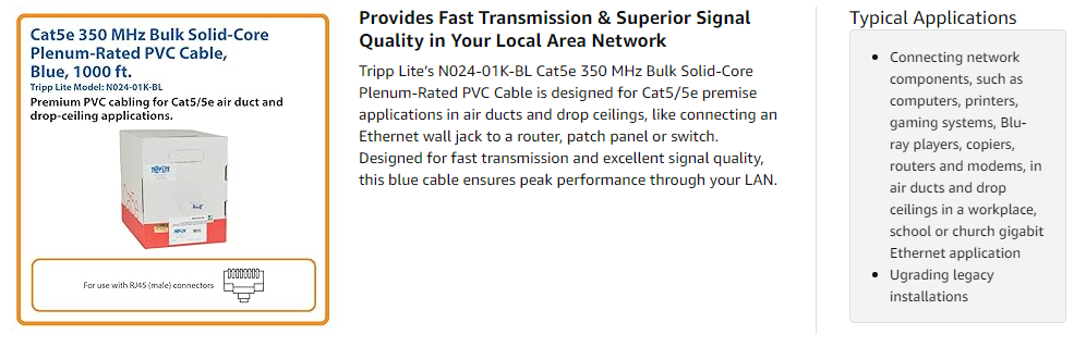 The N024-01K-BL is built to last in high-demand data center and networking applications. Manufactured from 24 AWG copper wire, it delivers speeds up to 350 MHz/1 Gbps. Protected by a durable plenum-rated PVC jacket, this cable is ideal for all horizontal wiring applications, including 10/100/1000 Base-T Ethernet, 100 Mbps TPDDI, 155 Mbps ATM, ISDN, voice and Token Ring Type 3. It meets or exceeds most current industry standards, including IEEE 802.3ab, IEEE 802.5, ANSI/EIA/TIA 568, ISO/IEC 11801 and ETL (category 5e, draft 11).